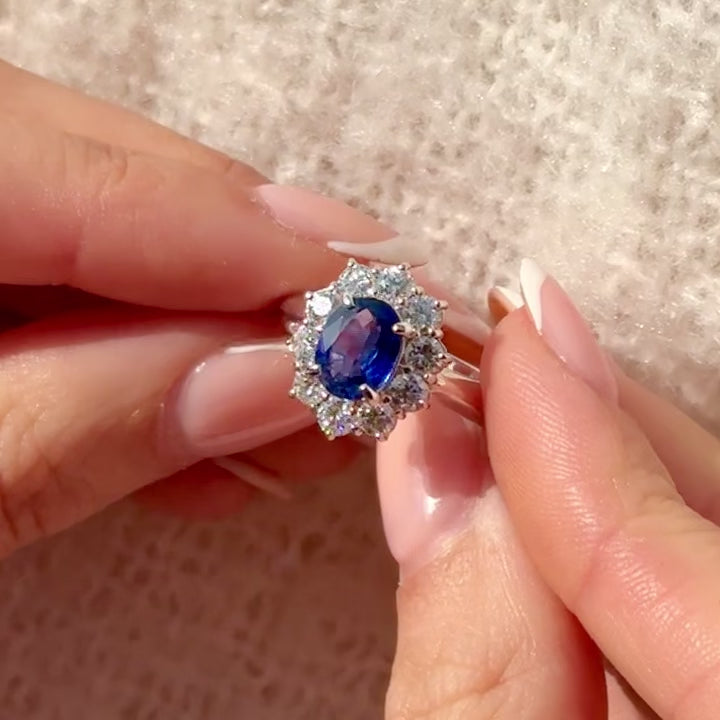 A vivid 1.35ct Ceylon sapphire shines in a platinum halo of 0.96ct diamonds—GIA certified and timelessly elegant for life’s most special moments.